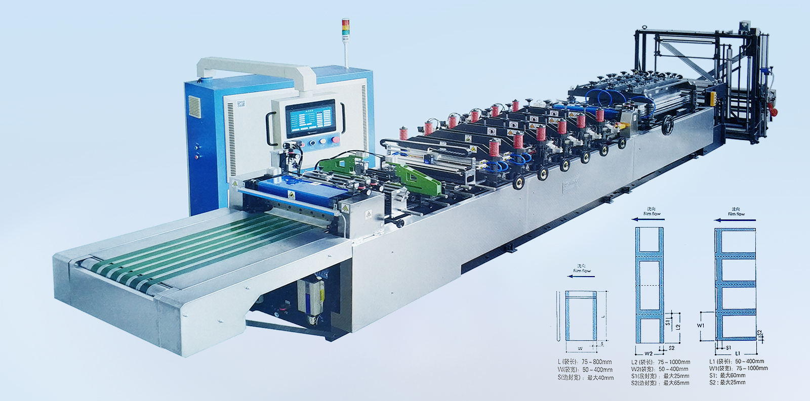 制袋寬度:500mm。 制袋長度:50-400mm(超長時(shí)可采用倍送裝置),制袋長度超過320mm 以上應(yīng)采用倍送功能。 注:由于袋型、材料等原因?qū)嶋H運(yùn)行速度會有所下降。